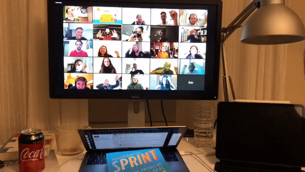 Outside speakers are major part of the Sprint Week and we were delighted to have Jake Knapp himself join us on two days to present and answer questions. This proved important as it reinforced that, despite not having a face to face sprint week, this was just as intense, innovative and important an experience for our students. This message was reinforced by VISA’s innovation team who have used Mural.co all this year, and by Roland Berger’s Spielfeld Digital Hub GmbH team who joined later in the week. Thanks to sponsorship from Roland Berger we could provide students with a copy of the book as well! [Jake is 4 along, 2, down, myself 2,1, Carsten 4,1].