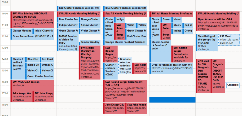 With so many moving parts during the week scheduling was vital. Outlook calendar proved the best tool available for this. Sharing my calendar with my admin support, and sending meeting invitations to all the students, either on-mass or in their clusters, allowed us to schedule the whole week. This also allowed dynamic changes during the week to be shared quickly with everyone and, crucially, handled time-zone challenges for those working overseas (though many of these students had decided to shift their body-clock for the week and so worked nights). Below is the final schedule for the week. Notice that during Wednesday and Thursday we had sessions where Roland Berger consultants mentored each group. This consultant feedback, (including from some who were our Alumni), was vital as it give industry-relevant feedback and reassured groups that the skills they were gaining were relevant to industry today! Finally we bought a cheap mobile phone and through this provided a WhatsApp, WeChat, Voice and Email helpdesk (manned by Dr Boyi Li) throughout the week.