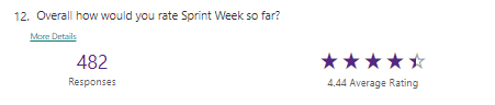 During a face-to-face sprint it is easy to gauge the mood of the teams and adjust the week accordingly – indeed this is one of the key skills of a facilitator. But for twenty-one online parallel groups this was impossible. As such I devised a daily “check-in” form using Microsoft Forms which each student needed to complete nightly and which I reviewed each morning. This was helpful in showing minor points for improvement, and also extremely satisfying to see the overall rating for the the week: