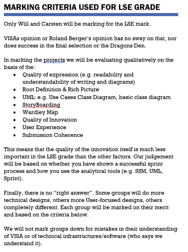The students received two forms of feedback for Sprint Week. The first was on Friday when I invited industry experts (from Visa and Roland Berger, PA Consulting, Government and Salesforce) to form a “Dragon’s Den” to watch the video pitches each group had prepared and judge the winners based on innovativeness of the pitch. This was a wonderful experience for groups and unveiled the “winners” of sprint week – who will go forward to present their ideas to VISA’s innovation labs next year.